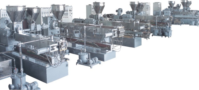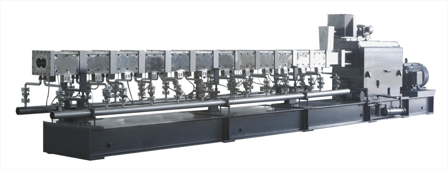 ZC系列雙螺桿擠出機由驅動部分與加工部分組成。驅動部分包括傳動箱與電機。根據(jù)機型特點,交流電機及直流電機可供選擇。傳動箱采用平行三軸式結構,具有液位計低油位報警、過濾阻塞超壓報警的功能。加工部分由兩根同向旋轉的螺桿芯軸、螺桿元件、筒體組成。筒體有閉合筒體、喂料筒體、排氣筒體。螺桿長徑比可根據(jù)加工工藝調整,螺桿元件隨加工物料性能組合可實現(xiàn)物料輸送、混合、塑化、剪切和脫揮。粒料、粉料、液體料可分別通過主料斗、側喂料斗或液體計量裝置加入,也可采用失重式多路喂料計量系統(tǒng)。